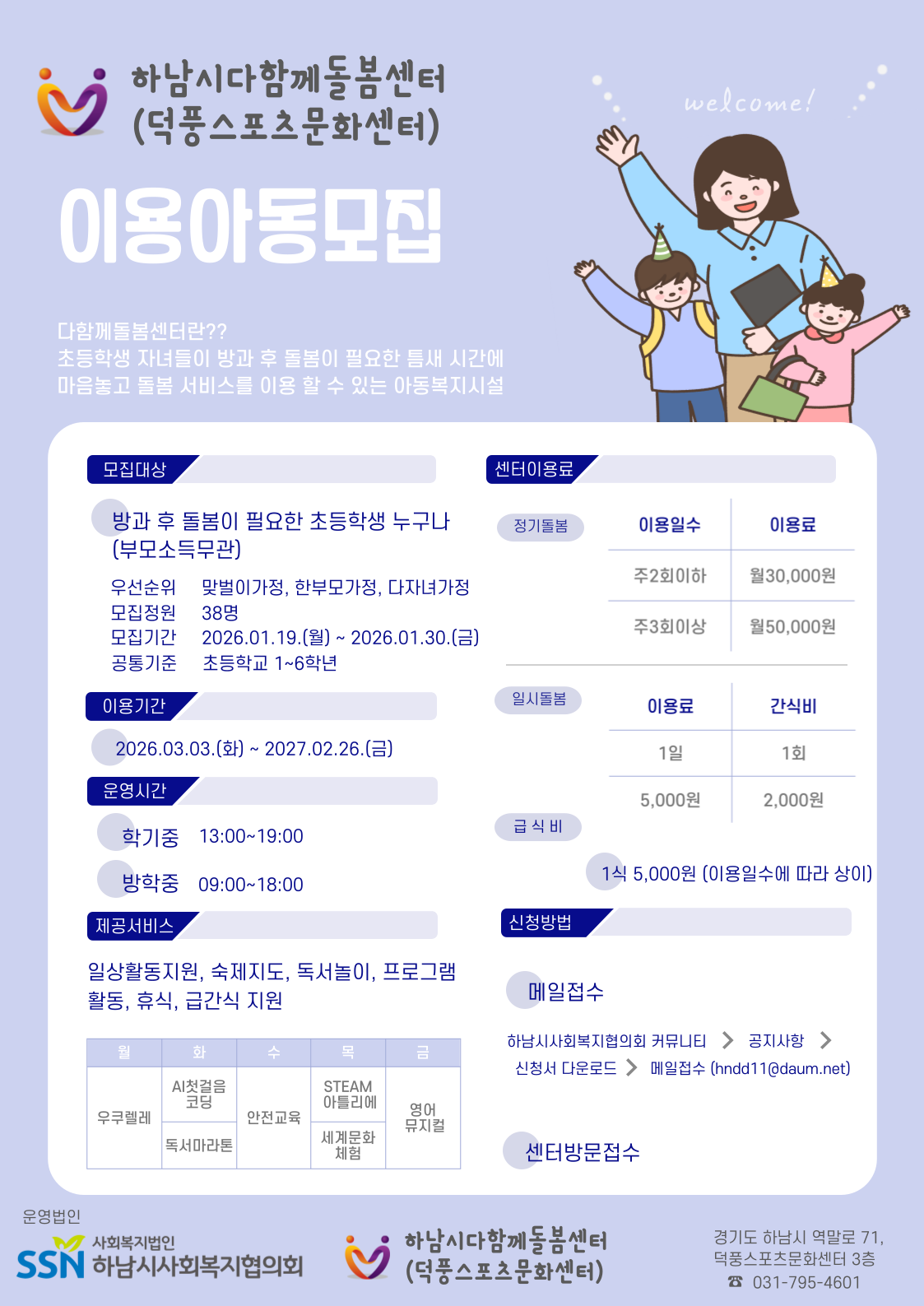 | 2026년도 하남시다함께돌봄센터(덕풍스포츠문화센터) 이용 아동 모집 | |||||