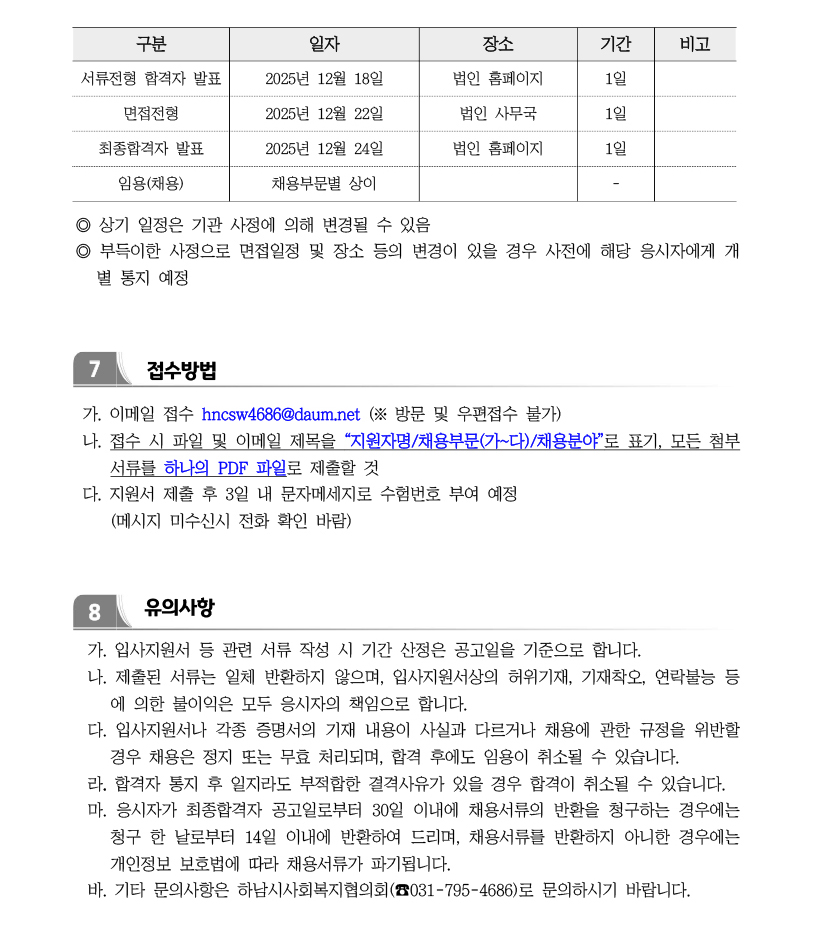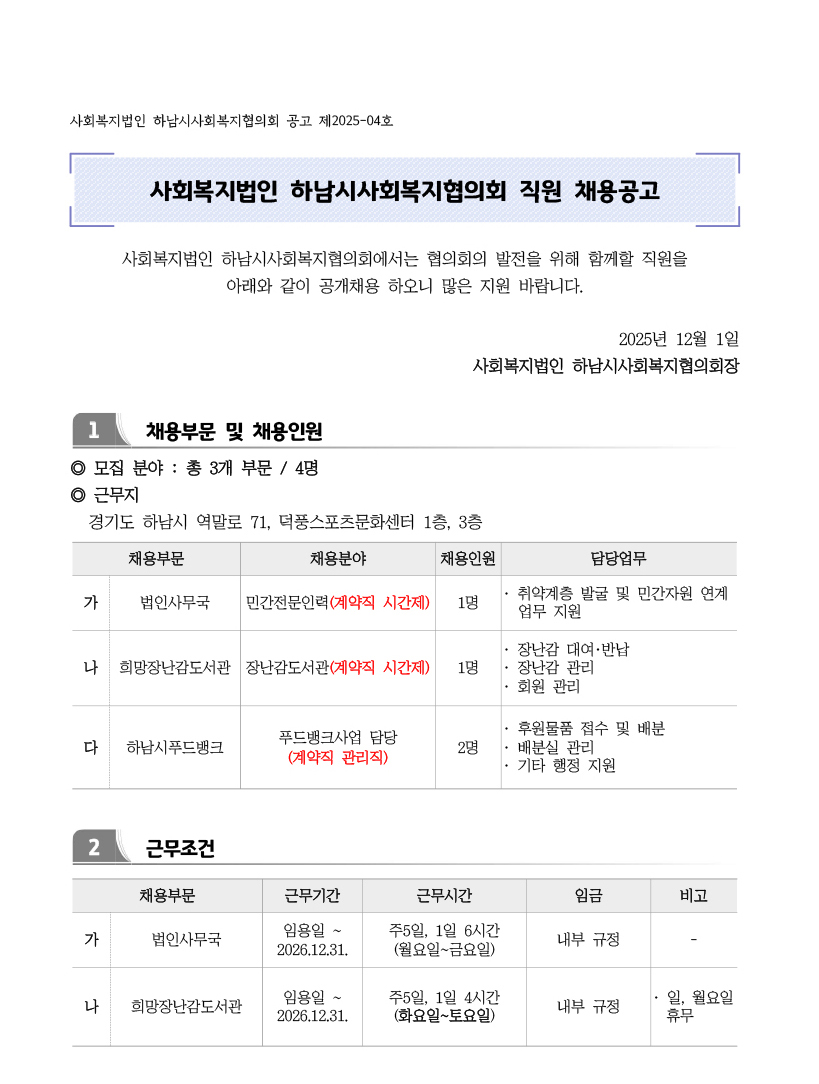 | 채용공고 제2025-04호 「사회복지법인 하남시사회복지협의회 직원 채용」 | |||||