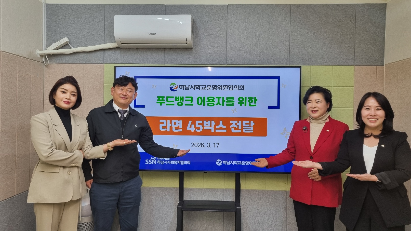 일 시: 2026년 3월 17일 (화) 장 소: 하남시사회복지협의회 사업명: 하남시학교운영위원협의회 푸드뱅크 이용자를 위한 식품 전달식 내 용: 하남시학교운영위원협의회에서 하남시푸드뱅크 이용자를 위한 식품(라면 45박스) 지원하여 전달식을 진행하였습니다. |